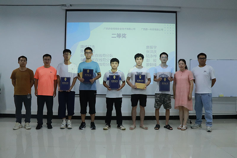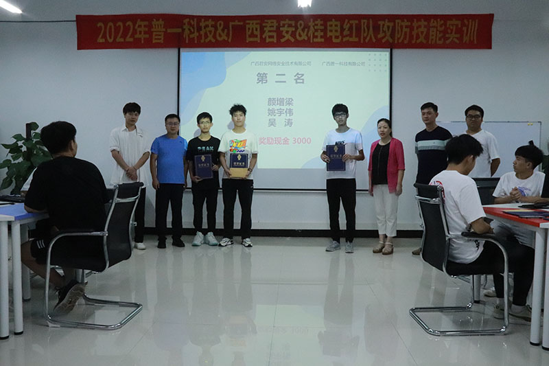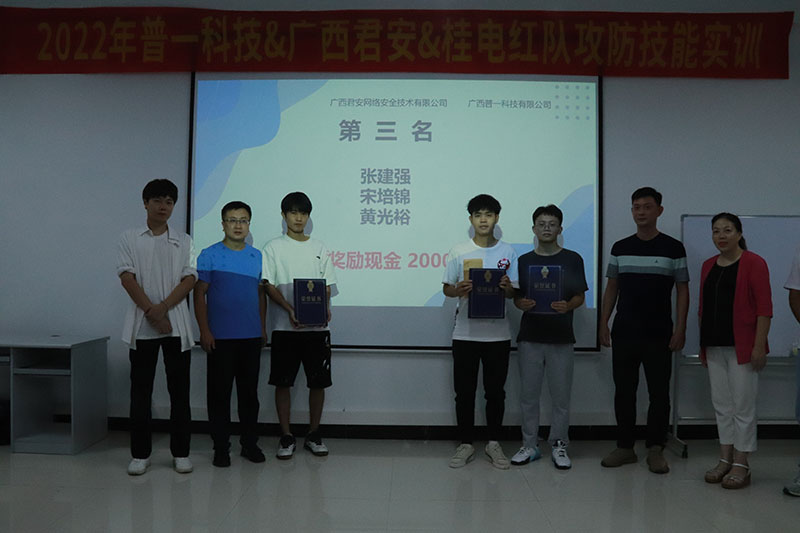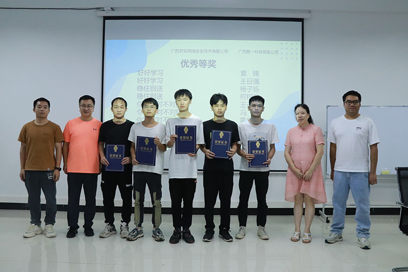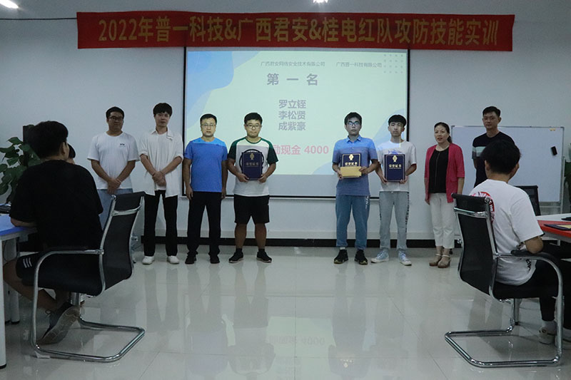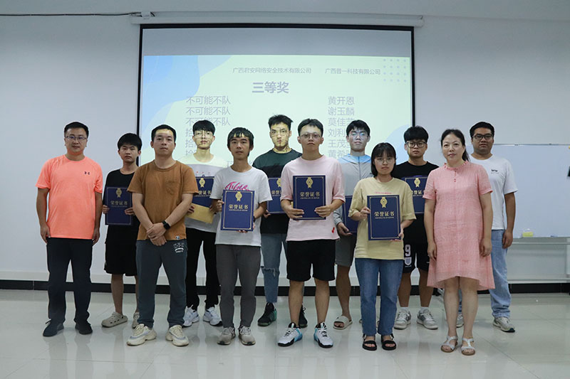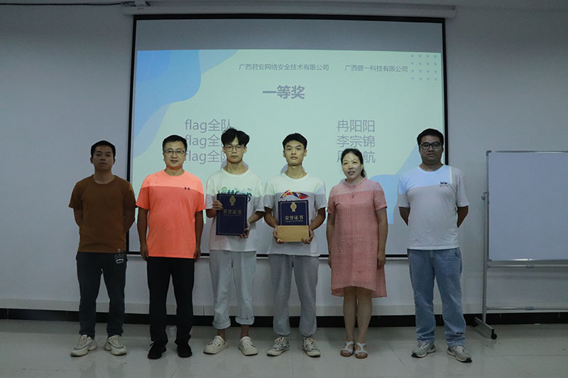 7月22號(hào)下午,紅隊(duì)攻防實(shí)戰(zhàn)技能培訓(xùn)結(jié)營(yíng)暨靶場(chǎng)任務(wù)頒獎(jiǎng)儀式在四創(chuàng)中心四號(hào)樓404實(shí)驗(yàn)室進(jìn)行。學(xué)院網(wǎng)絡(luò)空間安全專(zhuān)業(yè)負(fù)責(zé)人及安網(wǎng)閣指導(dǎo)老師陶曉玲、廣西普一科技有限公司安全技術(shù)總監(jiān)陽(yáng)漓斌、廣西君安網(wǎng)絡(luò)安全技術(shù)有限公司總經(jīng)理位磊、廣西普一科技有限公司高級(jí)威脅分析工程師梁月唯老師與應(yīng)急響應(yīng)工程師黃比精老師參加了這次的頒獎(jiǎng)儀式。