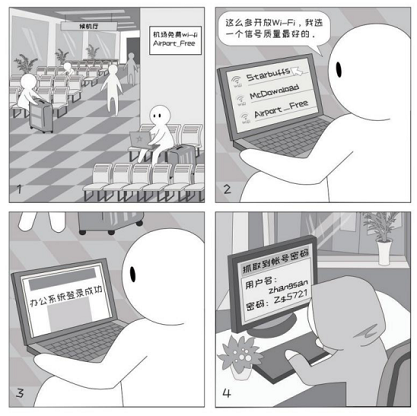 在餐廳、商場(chǎng)、火車(chē)站、機(jī)場(chǎng)等公眾場(chǎng)所,通常都部署了免費(fèi)的Wi-Fi熱點(diǎn),然而,攻擊者可能會(huì)創(chuàng)建一個(gè)有迷惑性的Wi-Fi熱點(diǎn),一旦連接到這些惡意熱點(diǎn),可能會(huì)導(dǎo)致信息泄露、流量劫持等風(fēng)險(xiǎn)。